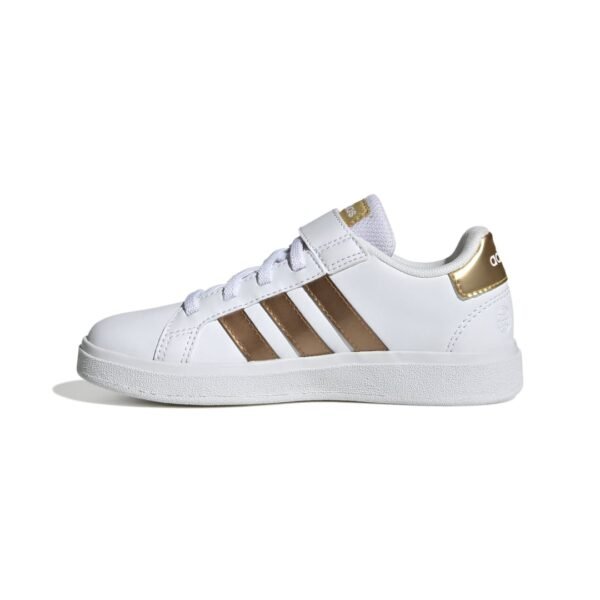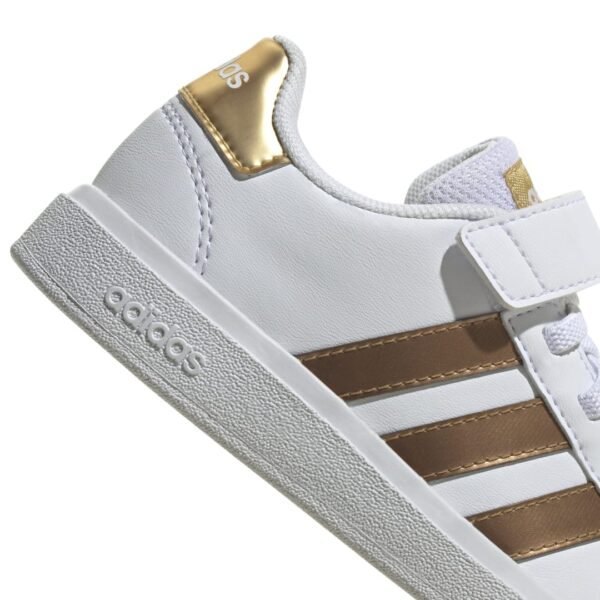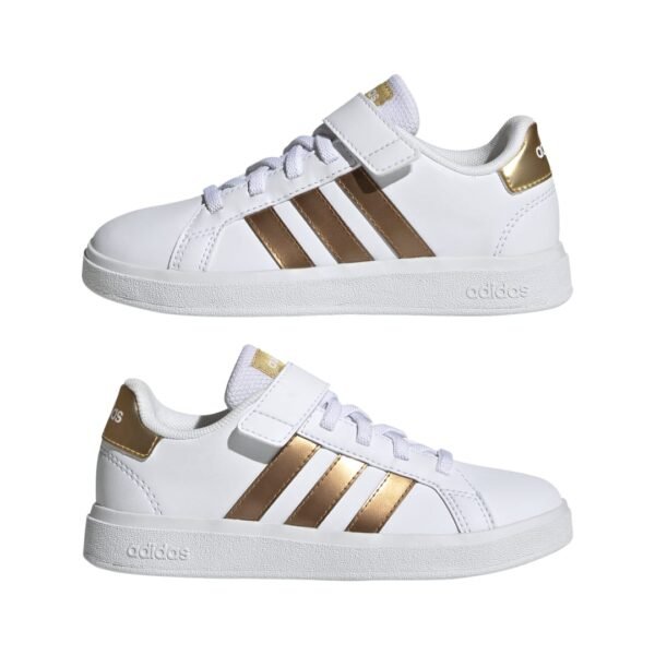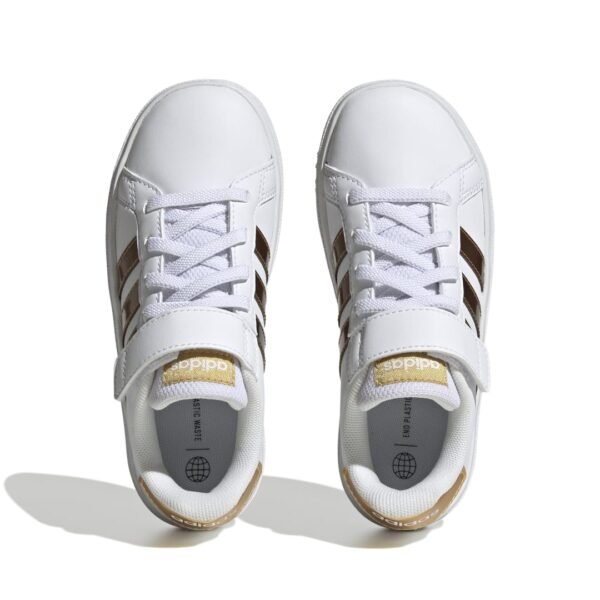 Αυτά τα παιδικά adidas παπούτσια ξεχωρίζουν με ανάλαφρη αίσθηση και λάμψη. Οι λαμπερές μεταλλικές λεπτομέρειες στις τρεις χαρακτηριστικές ρίγες της adidas, τη λεπτομέρεια φτέρνας και τη γλώσσα ξεχωρίζουν στο κλασικό Grand Court σχέδιο. Η τεχνολογία απορρόφησης κραδασμών Cloudfoam κάνει τη διαφορά στο ενδιάμεση σόλα, για άνεση και υποστήριξη σε κάθε τους κίνηση. Κατασκευή από ανακυκλωμένα υλικά, με επάνω μέρος από τουλάχιστον 50% ανακυκλωμένο περιεχόμενο.